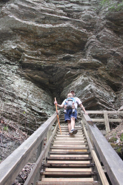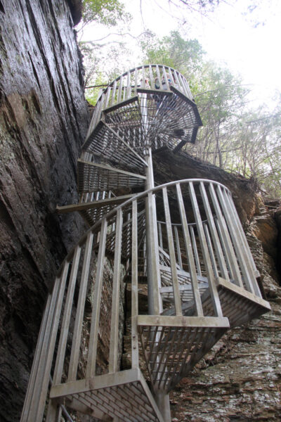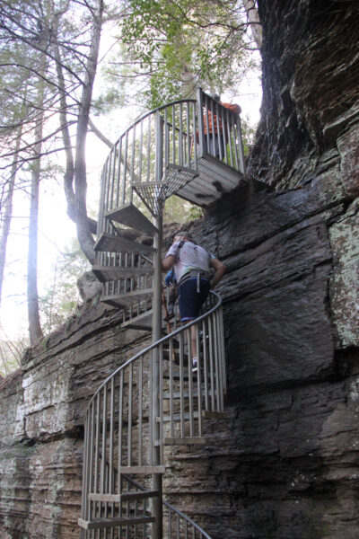 After visiting Upper Greeter and getting back to the loop trail, a big, metal (sometimes slightly slippery) spiral staircase installed in the woods leads down to Lower Greeter Falls, allowing walkers to descend down a vertical rocky section to access the main waterfall.