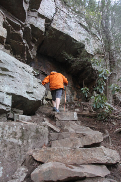 A hiker shouldn’t get bored on this trail, which is flat in some areas, steep in others, heavily wooded with towering old pine trees and other forestry, and featuring lots of rock face. Pay attention. It goes from flat to steep, uphill, downhill, along massive rock walls to creekside, rocky, rooty, and from leafy to sandy.