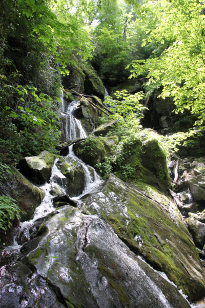 In fact, motorists on the Roaring Fork Motor Nature Trail—a scenery-packed, 5.5-mile, one-way driving tour that winds its way within the national park just outside of downtown Gatlinburg, Tennessee—may drive right up to this network of miniature waterfalls tracing out a lacework of water as it flows down the rocks in the mountains.