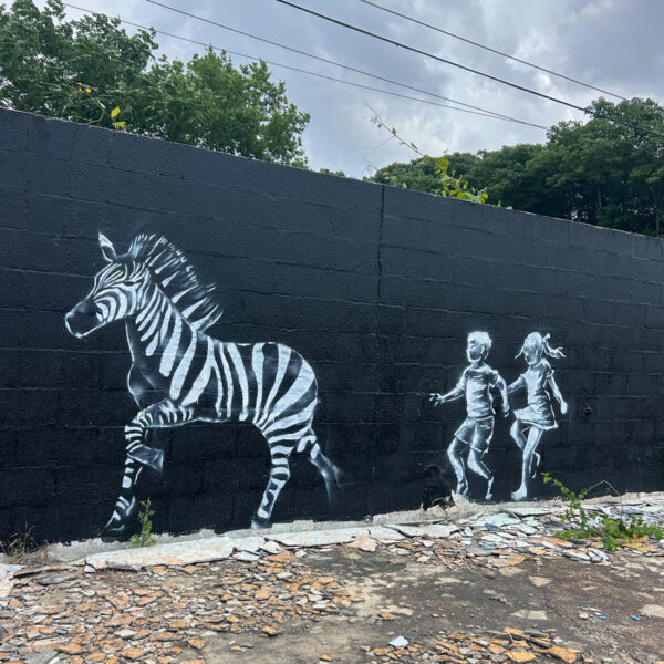 A zebra mural appeared in downtown Nashville at the corner of 8th and Edgehill, produced by the street artist Bandit.