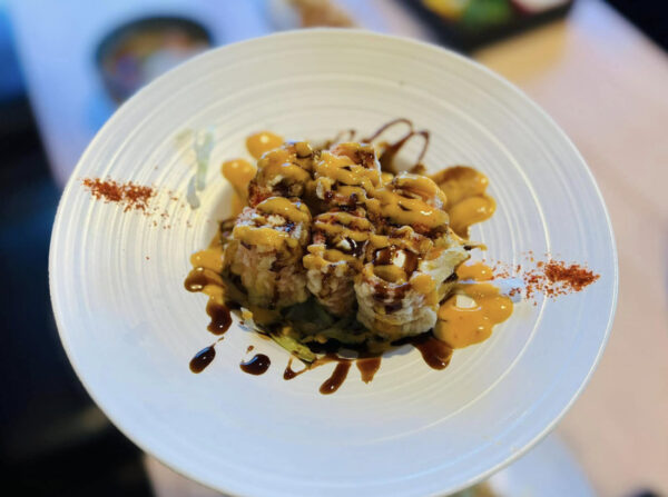 Many customers rave about the tempura crab—crab stick with cream cheese battered and fried, marrying a crispy fried crust with a rich and creamy interior.