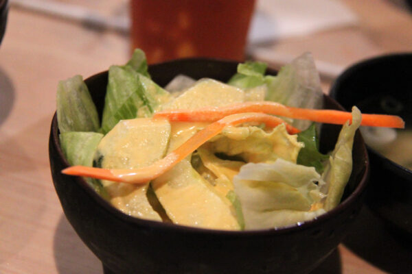 Shortly after ordering, salads arrive—delicious gingery dressing drips from the simple lettuce salad.