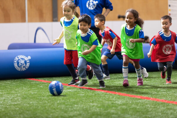 While the program is centered around soccer and teaches the rules and techniques to play the global sport—and also shows kids how to stretch and balance their bodies, and has them running sprints and dribbling the ball at times—other activities may have boys and girls and coaches blowing bubbles, kicking over cones, playing amoeba tag and engaged in all manner of different games and drills.
