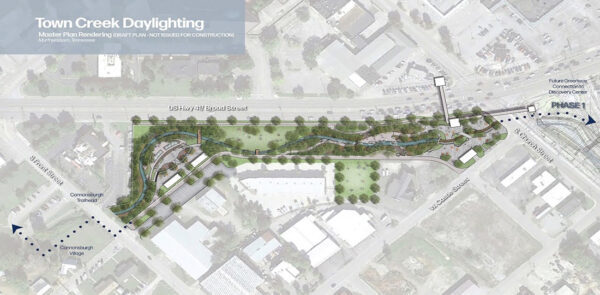 The construction phase of Murfreesboro’s Town Creek Daylighting Project is now well underway. Passersby will notice major changes to the area alongside Broad Street, with buildings demolished, ground moved, and water now flowing above ground.