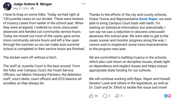 According to Judge Andrew Morgan, who took credit for bringing the bill to Lowe and Raper, “We are committed to battling truancy issues in schools.” You can read the rest of Judge Morgan’s comments in the screenshot provided where he outlines how battling truancy will “help ensure appropriate state funding for schools.” That folks, is the real reason for the push for “battling truancy” in Tennessee and across the nation. It is about money, power and control.