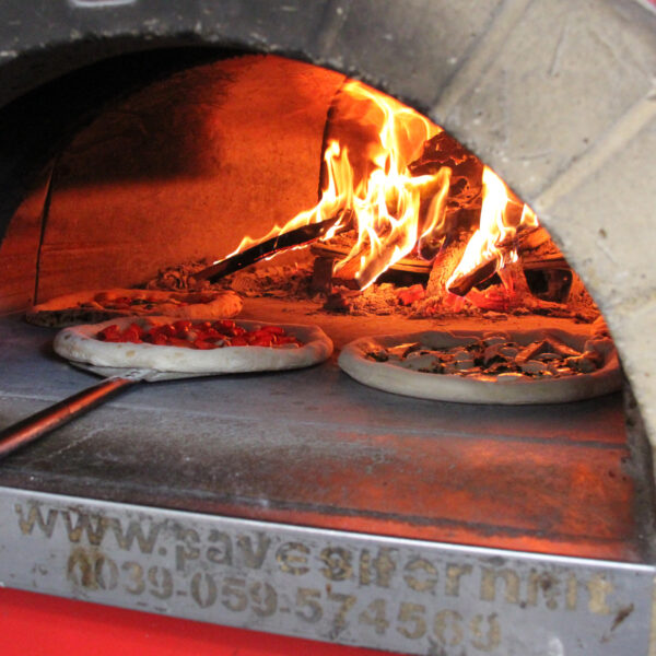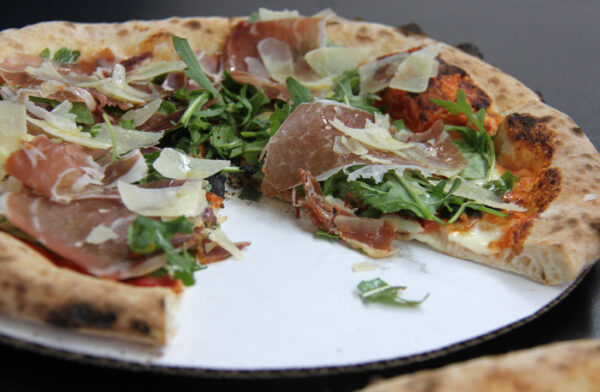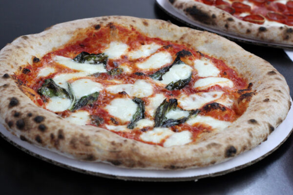 This method results in pies with a thin crust, displaying a wood-fired crisp on the outside with just a hint of char from the oven but a fluffy and light bready texture inside.
