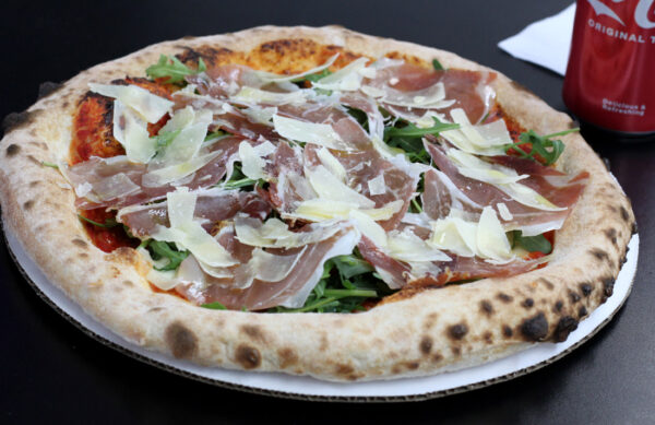 The pizzeria’s prosciutto pie is a simple cheese pizza, with the arugula, prosciutto and shaved parm added cold, after the pizza bakes.