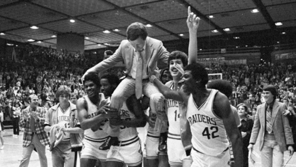Former MTSU men’s basketball coach Jimmy Earle gets carried off the court by members of the 1974-75 team after the Blue Raiders won the OVC tournament in Murphy Center on March 8, 1975 against Austin Peay. Photo courtesy of MTSU