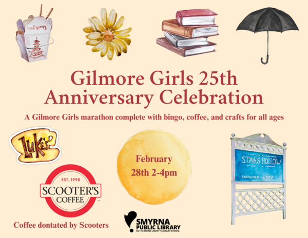 Visit Smyrna Public Library (400 Enon Springs Rd. W., Smyrna) from 2–4 p.m. on Saturday, Feb. 28, for a big fat happy sunshine day celebrating the 25th anniversary of the Gilmore Girls. The cozy afternoon will include a marathon of the show, coffee, bingo and crafts for all ages. For more information, email smyref@rclstn.org.