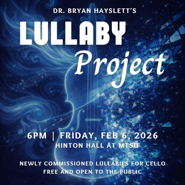Dr. Bryan Hayslett will present his Lullaby Project, a special cello faculty recital featuring the world premiere of newly commissioned cello lullabies written especially for him, at 6 p.m. on Friday, Feb. 6, in the MTSU Wright Music Building’s Hinton Hall. These new works explore the pathway to calm through both stillness and chaos, offering a reflective and expressive musical experience. In addition to solo cello, Hayslett will also sing, with two special guest artists joining the program. The concert is free and open to the public.