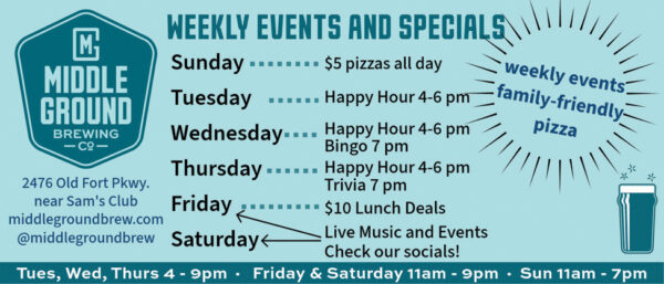 Come out to Middle Ground Brewing (2476 Old Fort Pkwy.) for a Crocheted Coaster Class on Saturday, Feb. 7, at 7 p.m. For more information, visit middlegroundbrew.com or find Middle Ground Brewing Co. on Facebook.