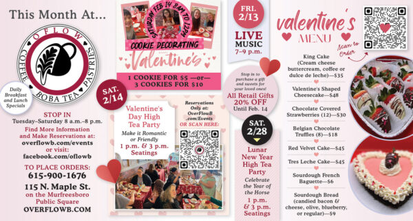 OFLOW (115 N. Maple St.) will host its Valentine’s Day high tea party on Saturday, Feb. 14, with seatings at 1 p.m. and 3 p.m. The limited-set menu will feature nine different pastries and savories as well as fresh-brewed loose leaf tea from Music City Tea, coffee from Narrow Gate Coffee, and Taiwanese Bubble Tea. The cost is $35 per person or $25 for children between 3–8 years old, plus tax. OFLOW asks that you dress for a high tea party (semi-formal or smart casual). There will be a prize for the best-dressed. Reservations are limited. A nonrefundable $10 per-person fee is required to secure your spot. For more information, visit overflowb.com/events or call 615-900-1676.