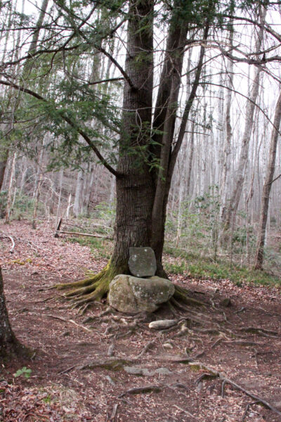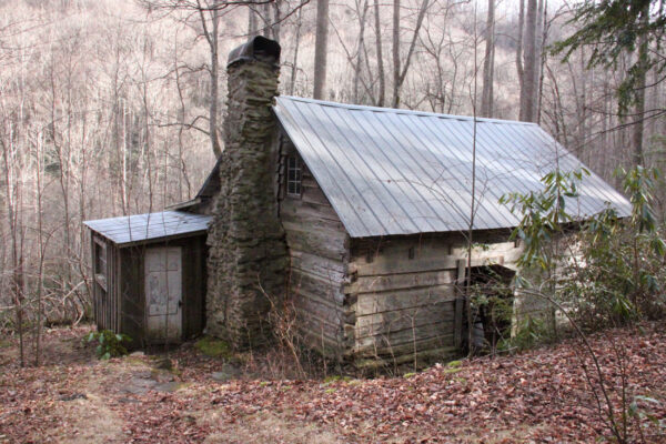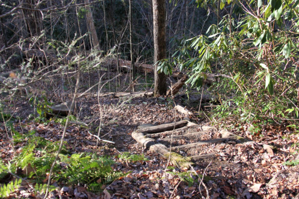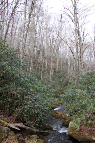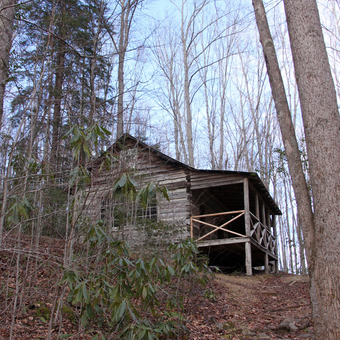 Those walking the trail, after roughly a mile from the parking area—and after passing by three different forks in the trail—may see a historic home-place structure in the distance perched on a facing hillside on the opposite side of the creek valley, if they happen to look over to the right through the thick forest.
