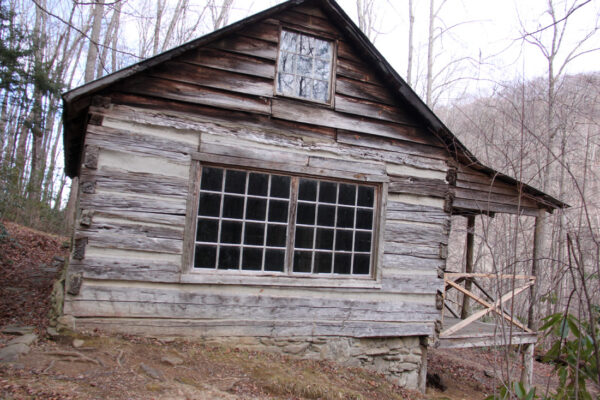 At the bottom of the hill, a narrow log footbridge with an attached handrail spans the creek, stretching probably 50 or 60 feet long, providing those who wish to venture up to the cabin a crossing above the rushing, rocky Jakes Creek. After cautiously crossing this, head up the hill to the old wooden home, known as the Avent Cabin, where a sense of quiet isolation sets in.