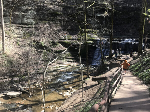 They can see the mighty Duck River looking directly below near the base of the steep hillside and a few farms far off in the distance. A brief walk down a paved sidewalk leads to a small but lovely cascade spilling into a shallow pool. The path is short and manageable, though uneven near the base. It’s a great “stretch your legs” stop during a scenic drive.