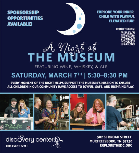 Rediscover your sense of wonder while sampling wines, spirits and brews on Saturday, March 7 at Discovery Center at Murfree Spring (502 SE Broad St.) from 5:30–8:30 p.m. at A Night at the Museum: Featuring Wine, Whiskey & Ale. Explore your inner child with playful, elevated fun, including a sophisticated scavenger hunt, silent disco and interactive surprises. Every moment of the night helps support the museum’s mission to ensure all children in the community have access to joyful, safe and inspiring play. Attendees must be 21 and up. Volunteers are needed to assist in serving samples and manning vendor tables. There will be local food trucks onsite. For more information, call 615-890-2300 or visit explorethedc.org.