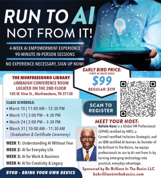 This March, Be Brilliant in the Basics will present a four-week AI training series—Run to AI, Not From It. Held on Tuesdays March 10 through March 31 at Linebaugh Public Library (105 W. Vine St.), the AI empowerment experience will help those curious about AI to embrace the technology and learn its tricks. Explore cool ideas, meet like-minded folks, and dive into the exciting world of artificial intelligence. Kelvin Goss, the founder of Be Brilliant in the Basics, will host. Session times are March 10 at 11 a.m., March 17 at 3 p.m., March 24 at 2 p.m. and March 31 at 10 a.m. Bring your own device. Register for Run to AI, Not From It by Be Brilliant in the Basics LLC on Eventbrite, or contact Kelvin Goss for more information at 281-451-2544.