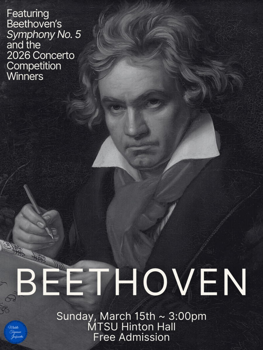 Middle Tennessee Sinfonietta will present its next free community concert on Sunday, March 15, at 3 p.m. in Hinton Hall at the MTSU School of Music (1439 Faulkinberry Dr.). The program features Beethoven’s legendary Symphony No. 5 alongside performances by the three winners of the 2026 Concerto Competition, Mov. I of Concerto No. 2 for piano and orchestra by Camille Saint-Saëns, Mov. I of Sinfonia Concertante for cello and orchestra by Sergei Prokofiev, and Ballade for saxophone and orchestra by Henri Tomasi. Admission is free and open to the public. For more on the Middle Tennessee Sinfonietta, visit mtsinfonietta.com.