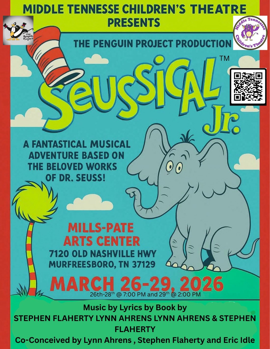Middle Tennessee Children’s Theatre and The Penguin Project will present Seussical Jr. at Mills-Pate Arts Center (7120 Old Nashville Hwy.) from Thursday, March 26, through Sunday, March 29. Performances are set for 7 p.m. on Thursday, Friday and Saturday, with a 2 p.m. matinee on Sunday. This family-friendly musical brings Dr. Seuss’s beloved characters to life through catchy songs and playful storytelling while celebrating themes of kindness, inclusion and self-confidence. The Penguin Project pairs young performers with special needs alongside peer mentors to guide them through the theatrical process, creating a unique and inspiring production featuring a full youth cast. The program is volunteer-driven and supported through donations and ticket sales. For tickets and more information, visit ticketstripe.com/mtctseussicaljr.