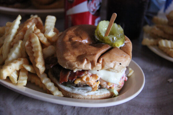 A couple of specialty burgers remain on the menu always: the pimento cheese and bacon burger, a mushroom Swiss burger, the Frito pie burger (containing chili, cheddar cheese, sour cream, jalapeño and Fritos), as well as the whipped feta, bacon jam and pickled onion burger—a “great combo of sweet and smoky,” another pleased diner said.